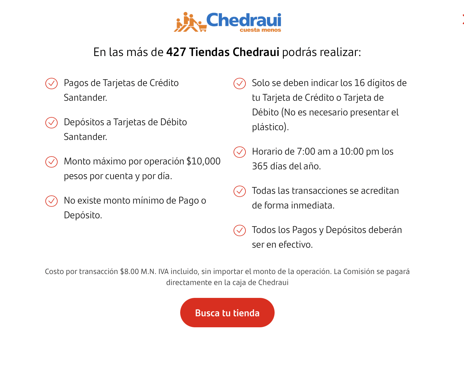 Por medio de esta alianza, la cobertura de Santander sumará más de 450 puntos de atención ubicados en los 25 estados donde la cadena de tiendas tiene presencia y brindará los servicios de depósito a tarjeta de débito y pagos de tarjeta de crédito en efectivo con sólo mencionar los 16 dígitos de la tarjeta, donde el monto máximo para ambos será de 10 mil pesos por cuenta y día, con un costo por operación de 8.00 pesos (IVA incluido).
